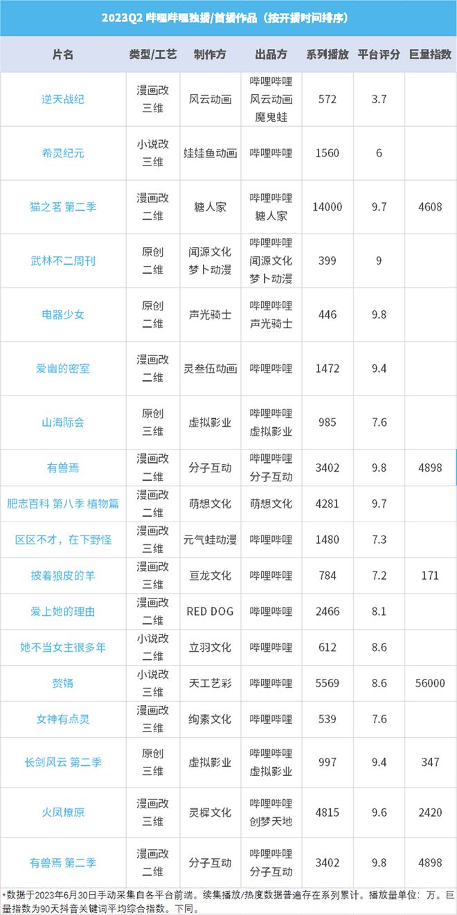 哔哩哔哩正在上季度功勋了18部独播动画的最众上新数目。此中二维和三维作品各占9部,是播出二维动画最众的平台◆◆。